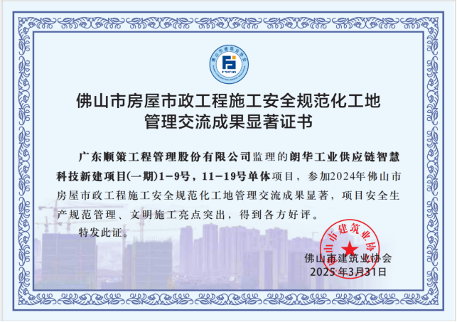 佛山市房屋市政工程施工安全规范工地管理交流成果显著证书