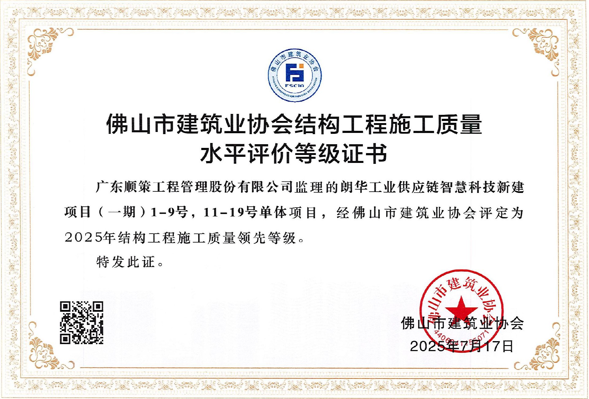 佛山市建筑业协会评定为2025年结构工程施工质量领先等级