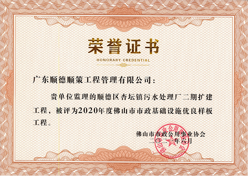 杏坛污水处理厂二期项目被评为佛山市2020年度市政基础设施优良样板工程