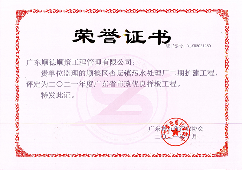 杏坛污水处理厂二期项目被评为广东省2021年度市政基础设施优良样板工程